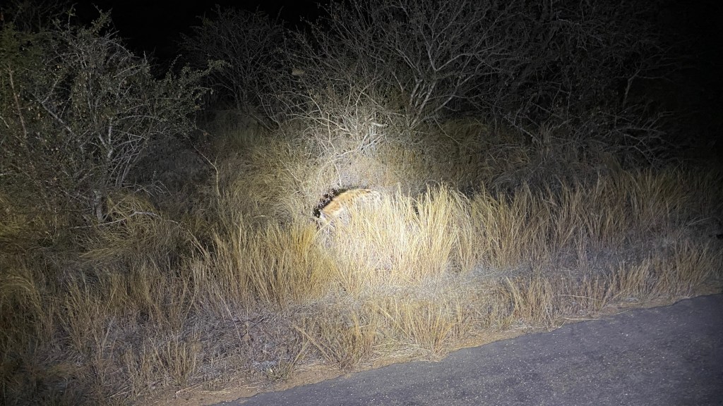 Petit plus : le safari nocturne : on n’a pas vu beaucoup de choses, on a eu un peu froid mais c’était convivial… Ici par exemple, on a pu empêcher une hyène de dormir, c’est une petite victoire…